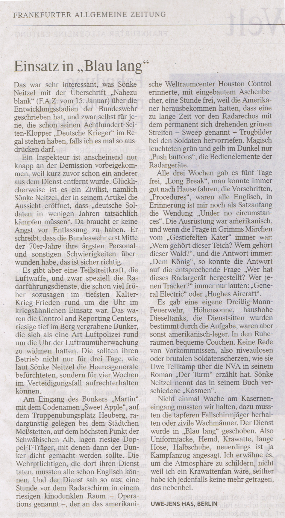 Die Erinnerungen eines Wehrpflichtigen des Radarführungsdienstes an seinen Alltagsdienst im kalten Krieg.Presseartikel aus der F.A.Z. vom 19. Januar 2024 Mehr erfahren